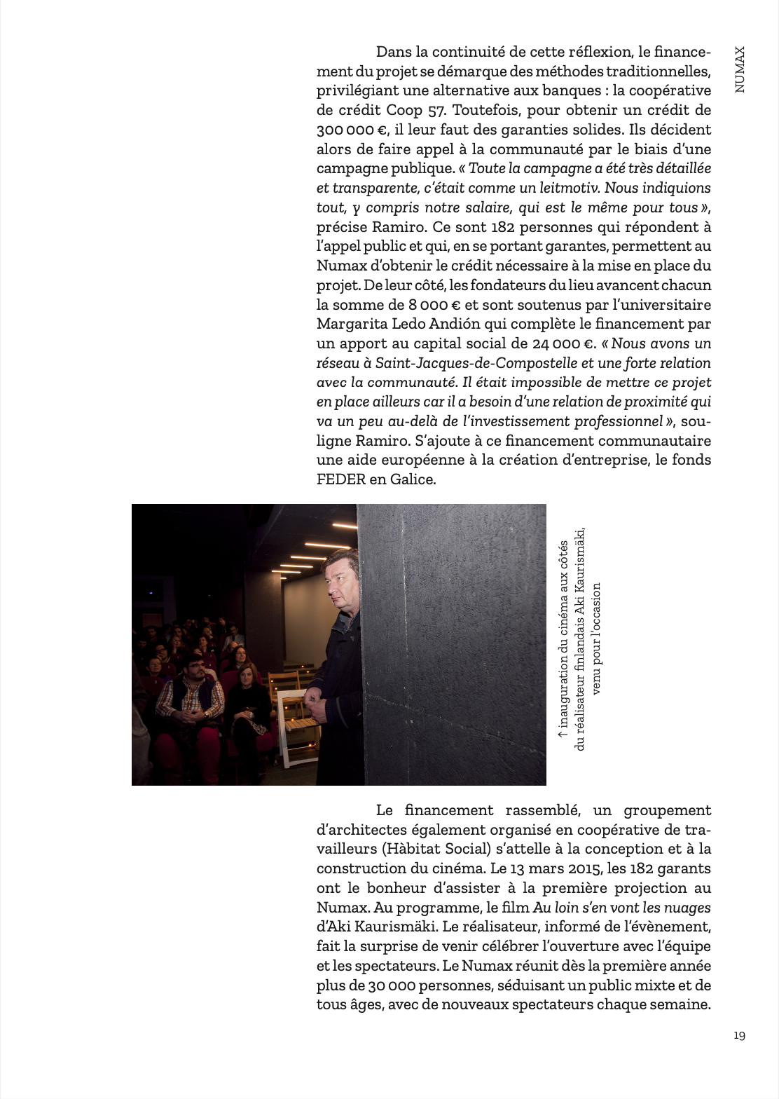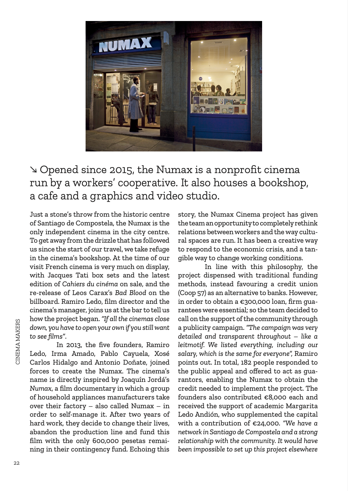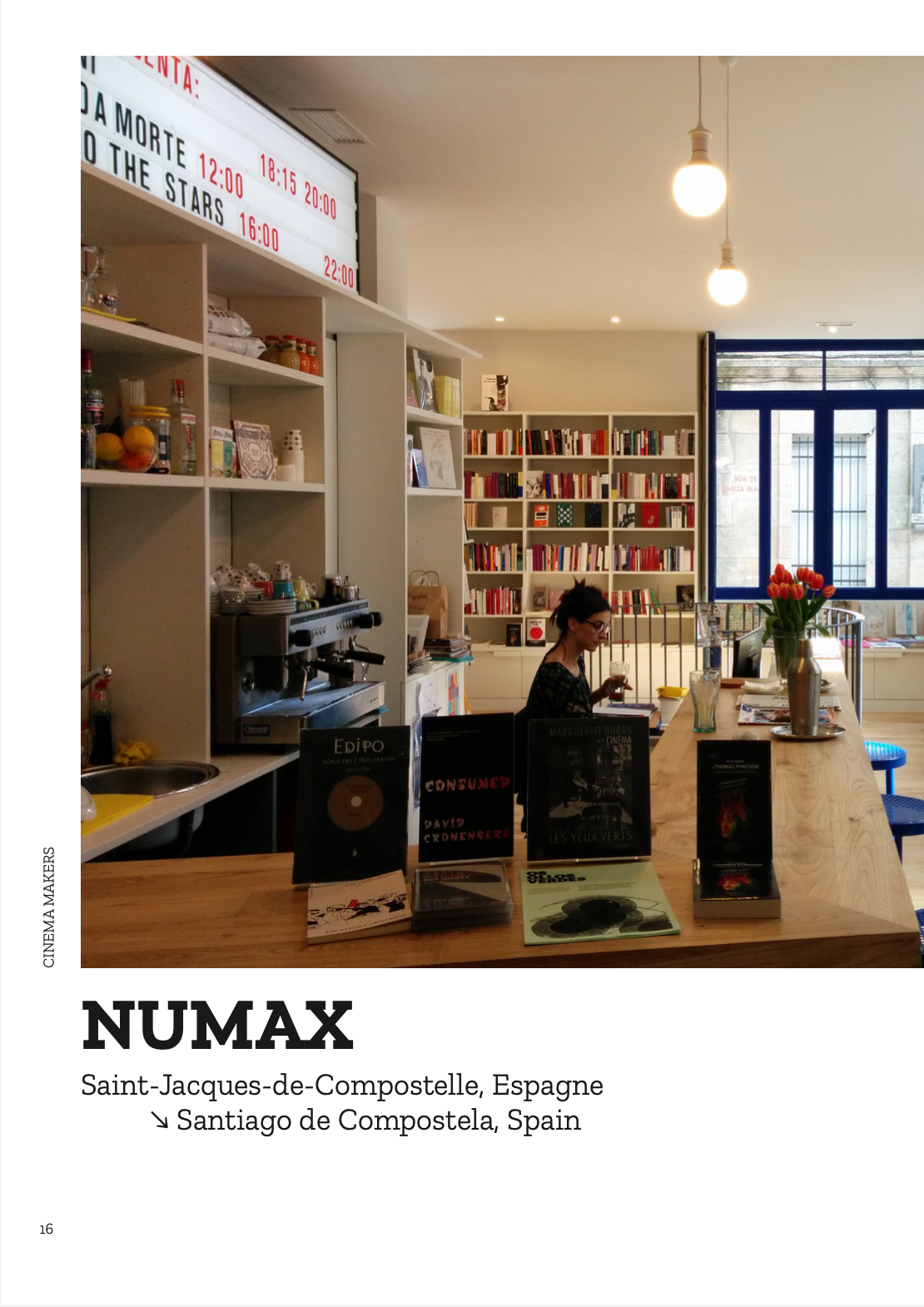 Pour fêter la réouverture des salles de cinéma en France, nous vous offrons le premier chapitre du livre d’Agnès Salson et Mikael Arnal, « Cinema Makers ». Nous vous emmenons donc aujourd’hui à la découverte du Numax, une salle de cinéma innovante située à Saint-Jacques-de-Compostelle, en Espagne, une aventure collective où se mêlent cinéma, café, librairie et laboratoire de création artistique. 21 autres rencontres, dans 13 pays différents, vous attendent dans cet ouvrage toujours disponible… Bons films !