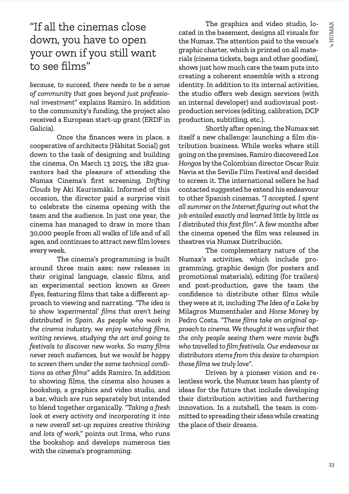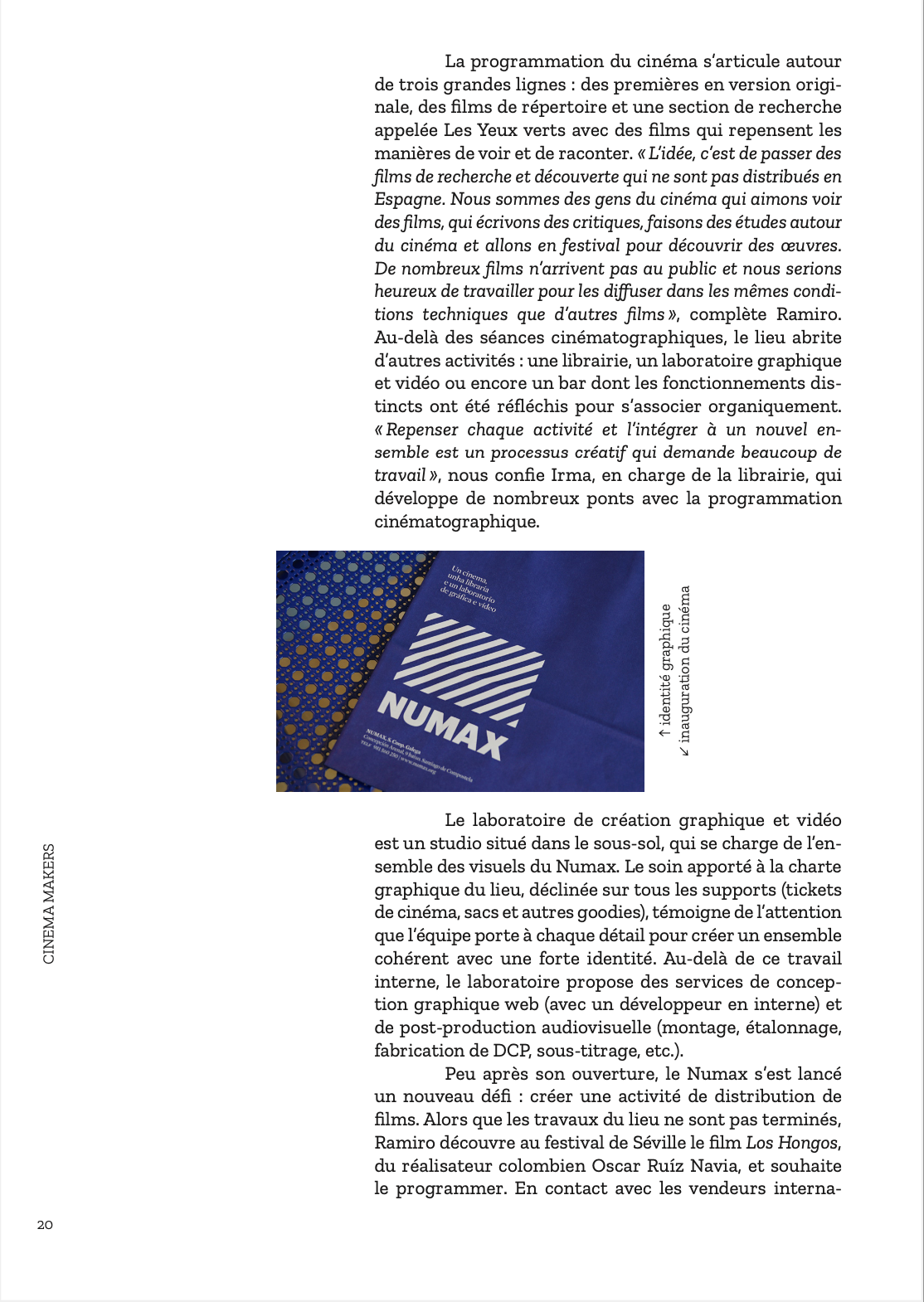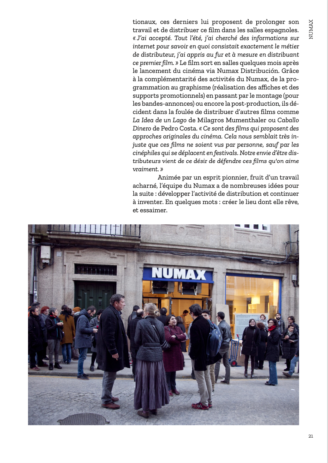 Pour fêter la réouverture des salles de cinéma en France, nous vous offrons le premier chapitre du livre d’Agnès Salson et Mikael Arnal, « Cinema Makers ». Nous vous emmenons donc aujourd’hui à la découverte du Numax, une salle de cinéma innovante située à Saint-Jacques-de-Compostelle, en Espagne, une aventure collective où se mêlent cinéma, café, librairie et laboratoire de création artistique. 21 autres rencontres, dans 13 pays différents, vous attendent dans cet ouvrage toujours disponible… Bons films !